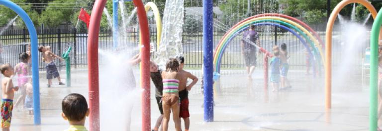 Take the bus to parks with water pads and beat the heat with your family this summer.